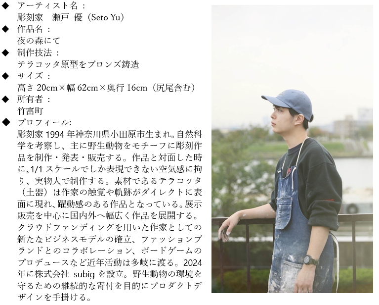 今回、制作をお願いした彫刻家 瀬戸 優様は、野生動物を専門に活動をされており、等身大の作品にこだわって制作されていることなどからお声掛けさせていただき、快く引き受けていただきました。