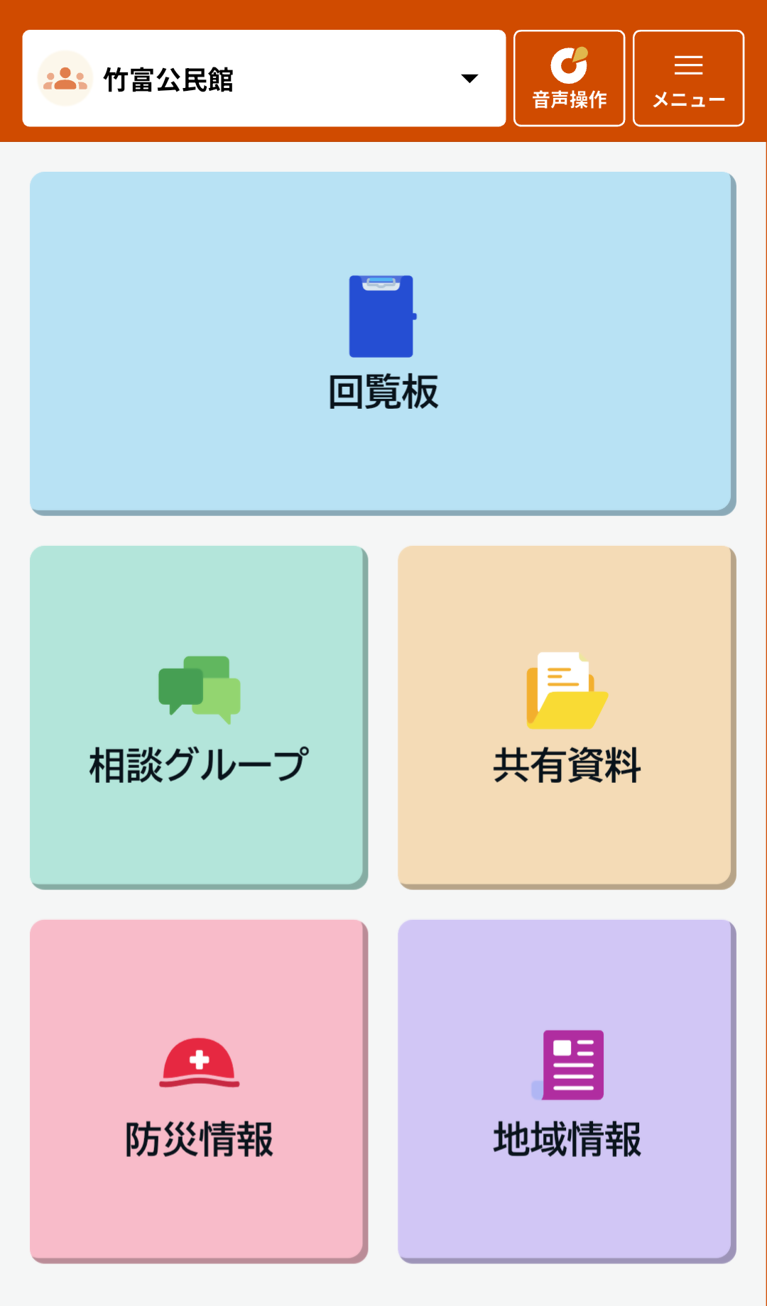 相談グループ | グループチャットに似た機能であり、特定のメンバー(公民館役員、青年会等)で情報の共有ができます。 | |