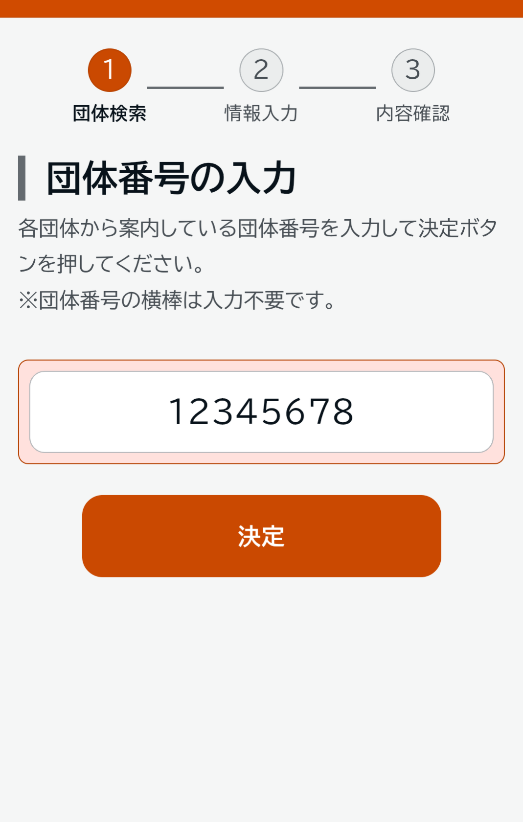 団体登録情報とは、各公民館毎に発行されているアプリ登録用の番号(一般会員は、8桁の数字)となります。