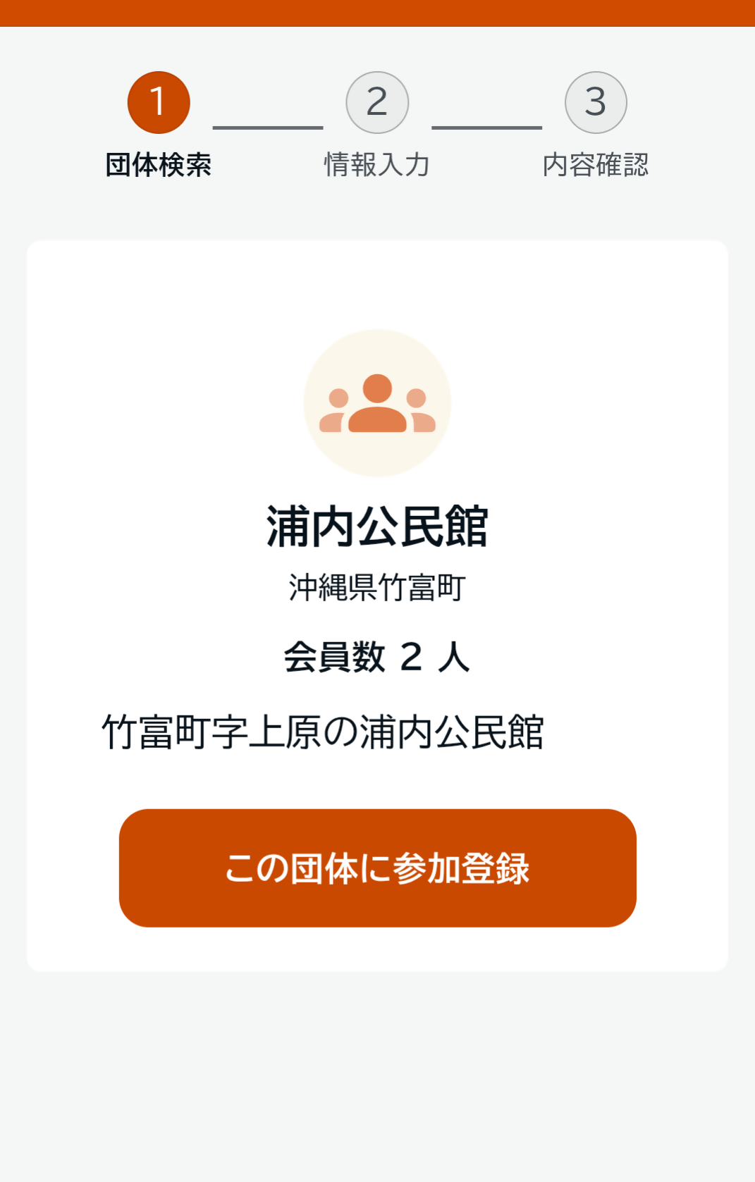 「団体登録情報を入力」を選択してください | 所属する公民館の団体番号を入力してください | 「この団体に参加登録」を選択してください |