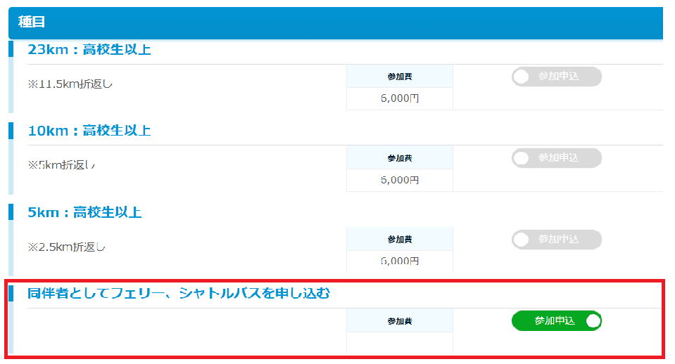 ネット予約の場合は、種目欄を「同伴者としてフェリー、シャトルバスを申し込む」を選択してください。