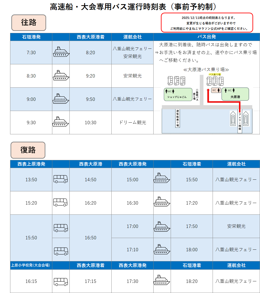 最新の高速船及び大会専用バスの運行は下記の通りとなります。